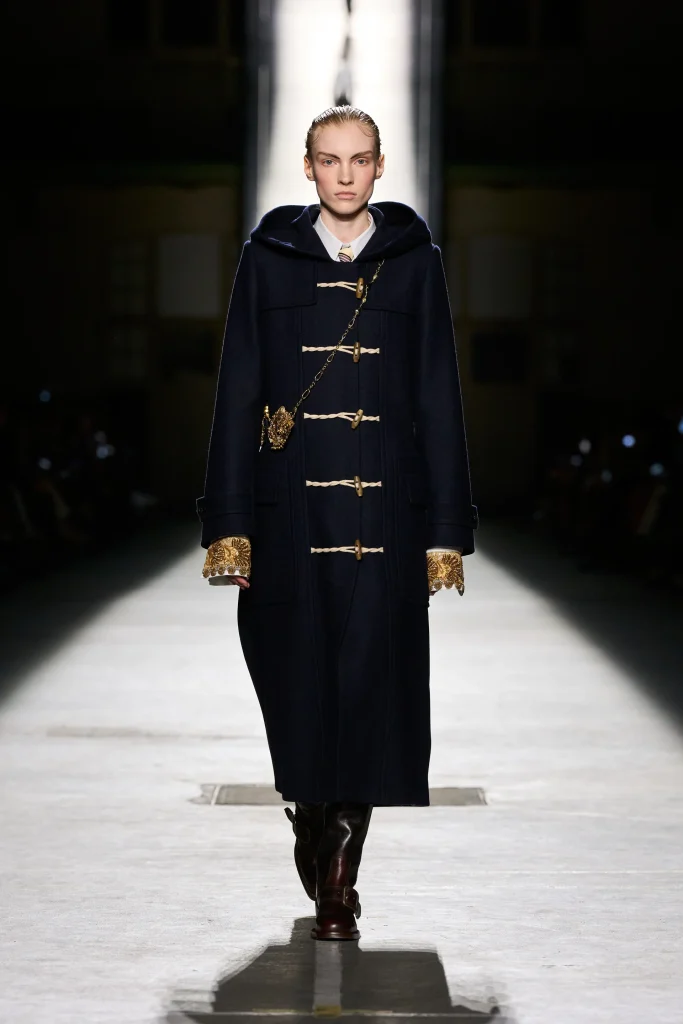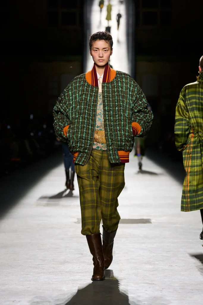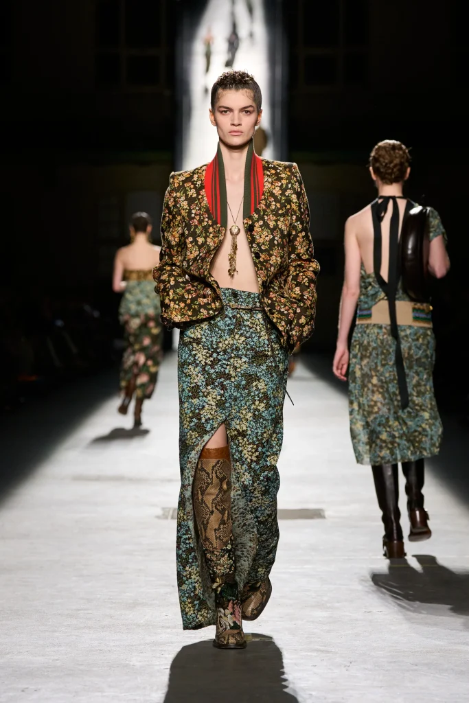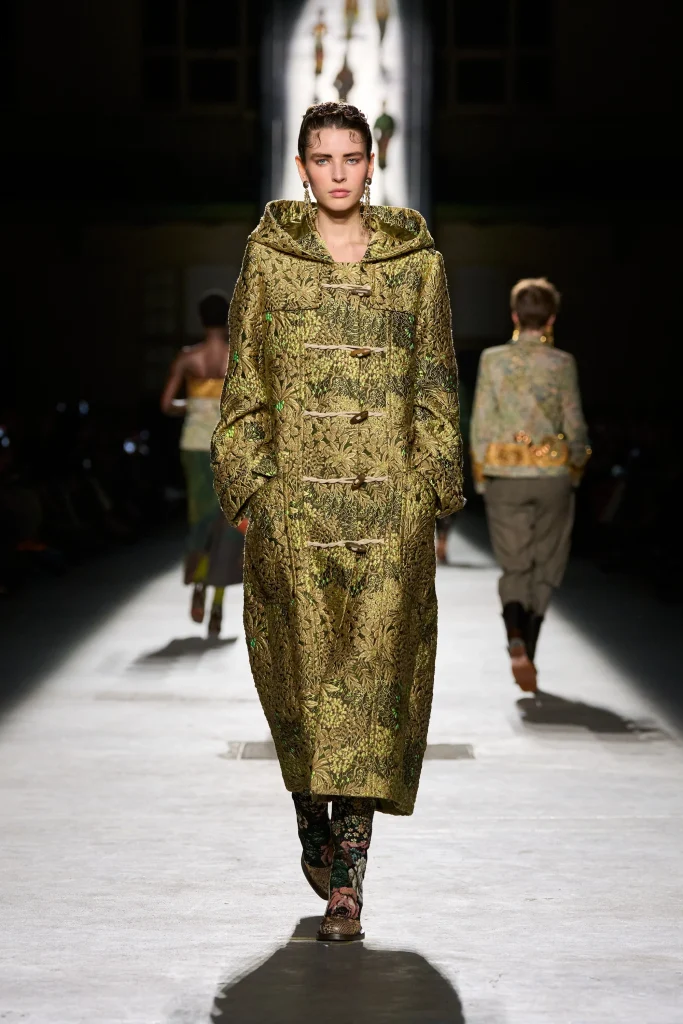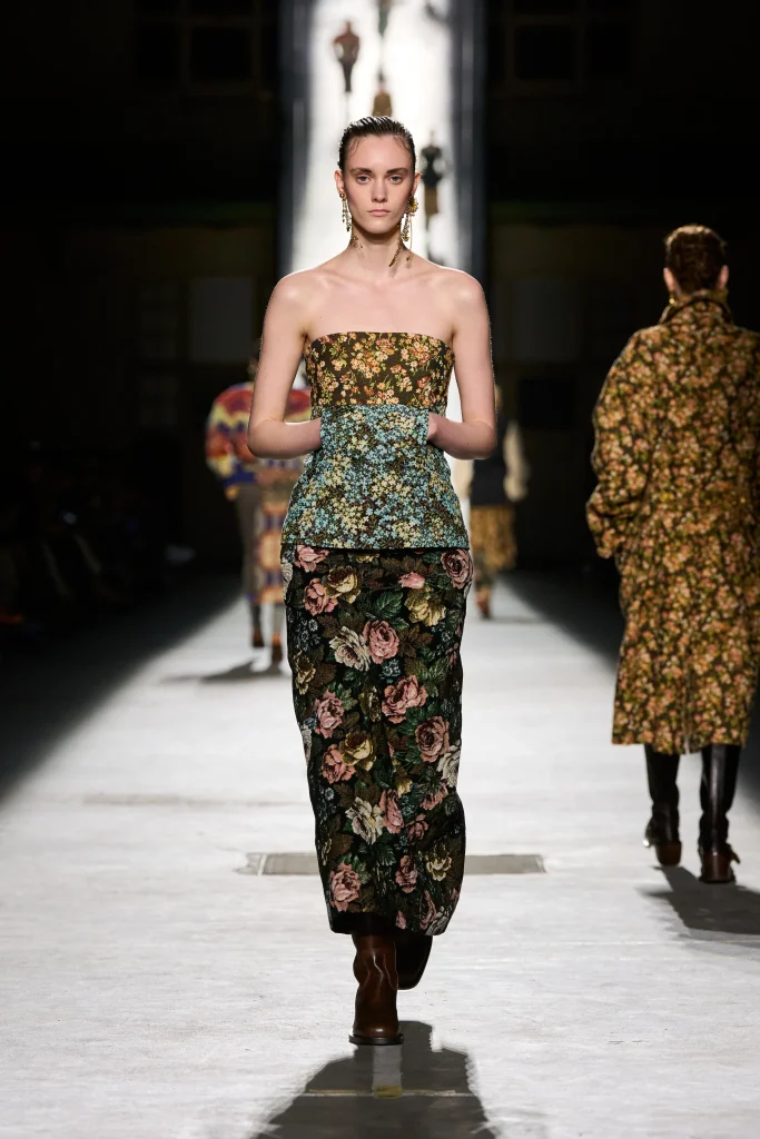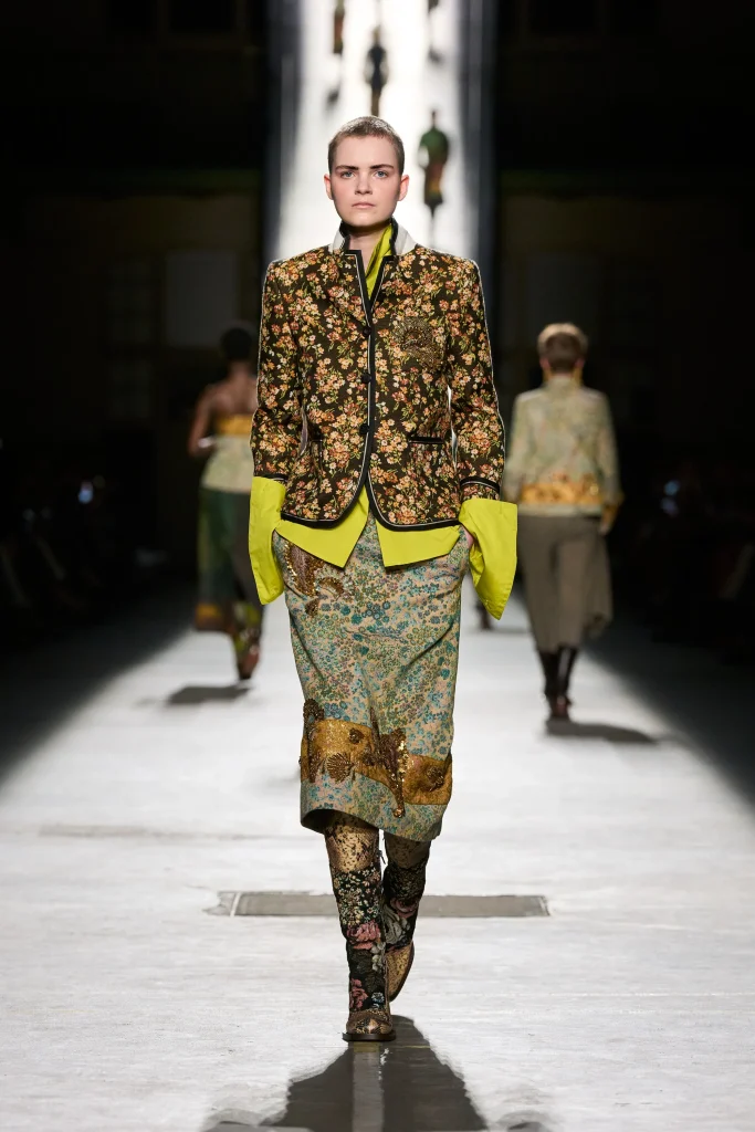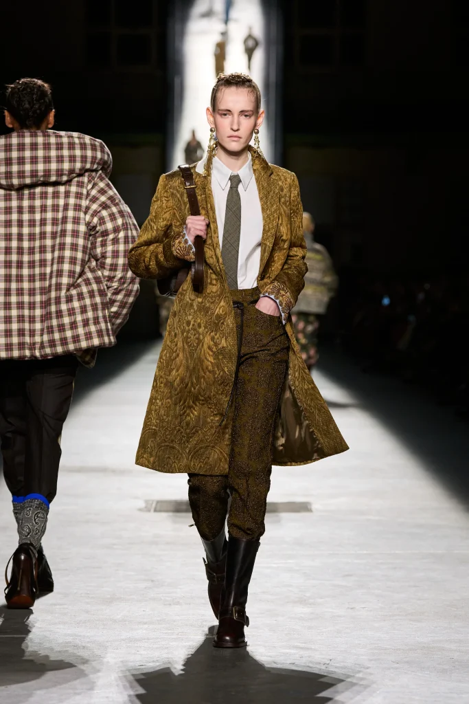 Le lycée, c’est aussi l’uniforme, donc la silhouette comme contrainte. Vogue Runway décrit un départ très “preppy”, avec duffle-coat, chemise-cravate, blazer, soit un vocabulaire scolaire immédiatement lisible. C’est une entrée qui calme les choses : on comprend où l’on est, on comprend ce qui est en jeu, on comprend la règle. Ensuite, la règle se fissure, mais elle reste la règle, ce qui évite l’impression de collage gratuit. Le miroir à l’entrée, lui, fait son travail de garde-fou : si le vêtement devient trop “costume”, il se trahit dans le reflet. On est loin de la nostalgie sucrée, plus proche d’un malaise précis, celui des codes qu’on porte avant de les choisir. Le décor n’explique rien, il cadre, et c’est souvent ce qu’un bon décor devrait faire. La question devient alors : comment sortir de l’uniforme sans perdre la tenue. C’est exactement l’endroit où Dries Van Noten a toujours été bon, à condition de rester dur sur la coupe.