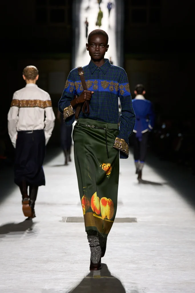 Vogue Runway raconte la bascule : aux bases scolaires répondent des carreaux grunge, des motifs de natures mortes du XVIIe siècle parfois pixelisées, des varsity jackets, du denim déconstruit. On voit là une adolescence stylisée, oui, mais pas “jeune” au sens marketing, plutôt jeune au sens embarrassé, contradictoire, entêté. Les imprimés et les textures viennent heurter le vestiaire propre, comme une tache sur une chemise blanche, sauf que la tache est volontaire et très travaillée. Le grunge, ici, n’est pas un folklore ; il est tenu par une construction précise, ce qui le rend presque plus cruel. Le pixel, surtout, évite la poésie : il rappelle l’image, l’écran, le fait que beaucoup de regards sur la mode passent désormais par des fragments. Klausner semble accepter cette réalité sans la fétichiser. L’adolescence du show n’est pas un thème, c’est une mécanique : essayer, superposer, se rater, recommencer. Et tout ça sans jamais lâcher totalement la structure, parce qu’à ce niveau de maison, lâcher la structure revient à lâcher le produit.