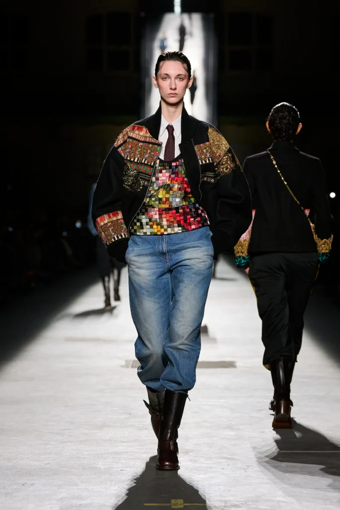 Les plus belles réussites sont celles où le mélange garde une logique d’atelier. Vogue cite une veste collégienne portée avec une jupe montée en rubans brodés, puis un manteau jacquard bronze avec manches en maille côtelée. Le contraste est évident, mais il n’est pas paresseux : il passe par des coutures, des assemblages, une idée de main, donc par du temps. Un autre exemple donné par Vogue va dans le même sens : une veste en denim associée à une jupe dont l’effet “pixel” revient en fil de soie, sequins et perles de verre. On n’est pas dans l’ornement comme poudre aux yeux, plutôt dans l’ornement comme preuve de contrôle. Le danger d’un tel show serait de devenir un inventaire d’effets, et le lycée aurait alors l’air d’un décor plaqué. Ici, la contrainte scolaire empêche le défilé de partir en roue libre. La silhouette reste identifiable, même quand la surface s’énerve. C’est une violence polie, exactement le registre qui sied à Dries Van Noten quand il veut être moderne sans devenir cynique.