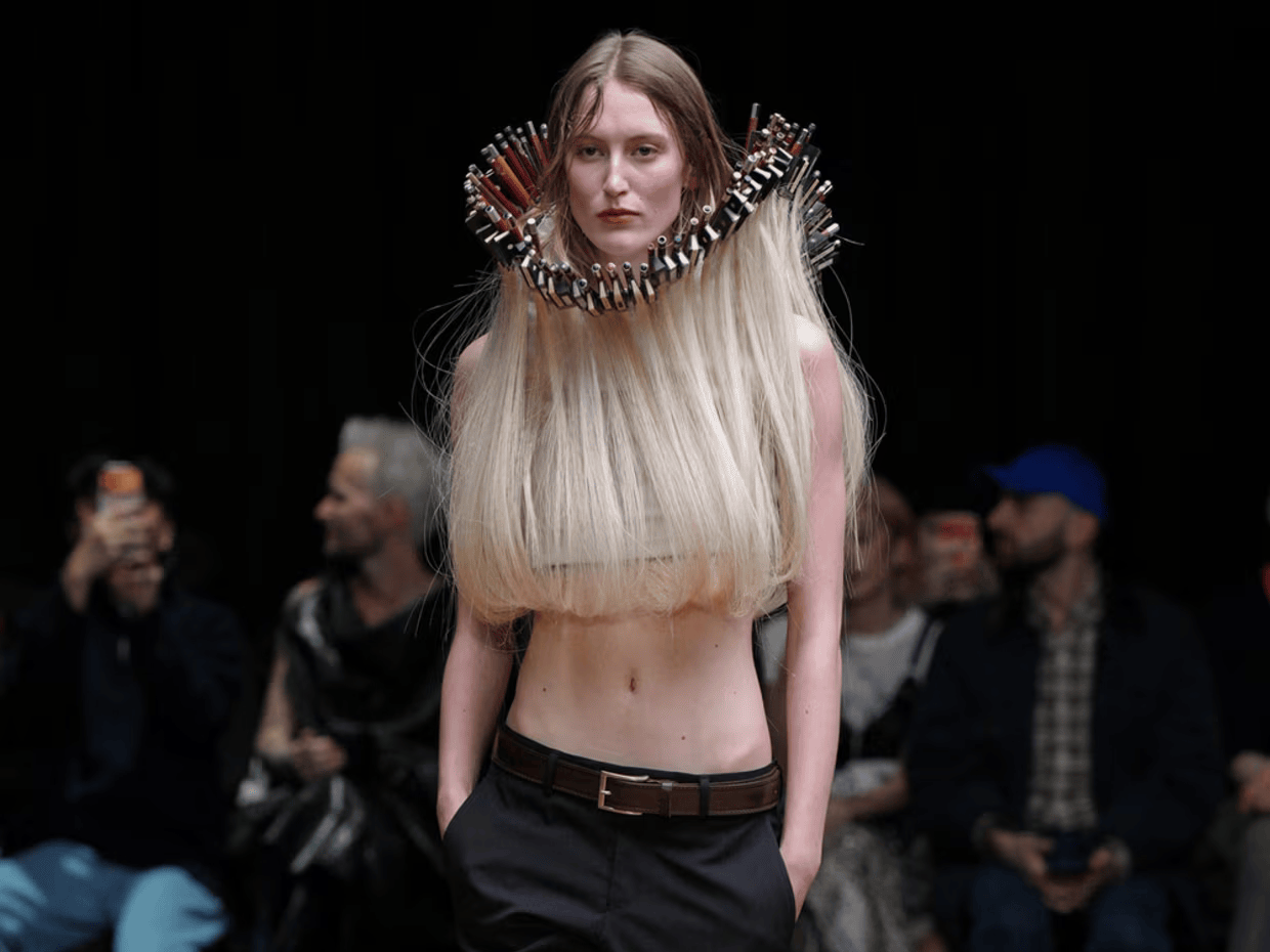 Le détail le plus parlant, ici, c’est ce qui “attache” le corps. Vogue Runway précise que les fils soyeux qui serpentent et se rejoignent au cou ne sont pas des mèches, mais des cordes de violon en crin de cheval. La référence beauté citée est celle d’un “pianiste en sueur”, bien habillé au départ, puis absorbé par l’action. C’est un fantasme de maîtrise qui finit en perte de contrôle, et on le voit dans les formes voûtées, celles qui serrent le corps au lieu de l’ouvrir. Dans un autre article, Vogue repère aussi, à Paris, une poussée de couvre-chefs très marqués, et y inclut Hodakova avec ses visages-miroirs et ses violons détournés. Là encore, l’accessoire ne décore pas : il masque, il renvoie, il complique. Et le défilé se referme comme il a commencé, avec un intérieur qui reste un peu inhabitable.