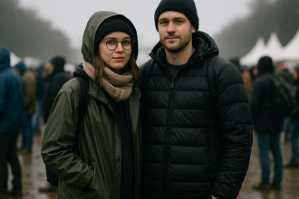 Les accessoires confirment cette quête de tranquillité stylistique. Le sac banane porté en travers est l’élément totem de la soirée, concentré de pragmatisme et de sérénité émotionnelle. À l’intérieur, l’essentiel : téléphone chargé, clés, portefeuille, et une foi profonde dans le bon déroulement des choses. Les lunettes restent discrètes, parfois encore sur le nez alors qu’il fait nuit depuis longtemps, comme si les enlever constituait déjà une prise de risque inutile. Le manteau s’ouvre et se referme au fil de la soirée, non par coquetterie, mais par souci constant d’équilibre thermique et psychologique.