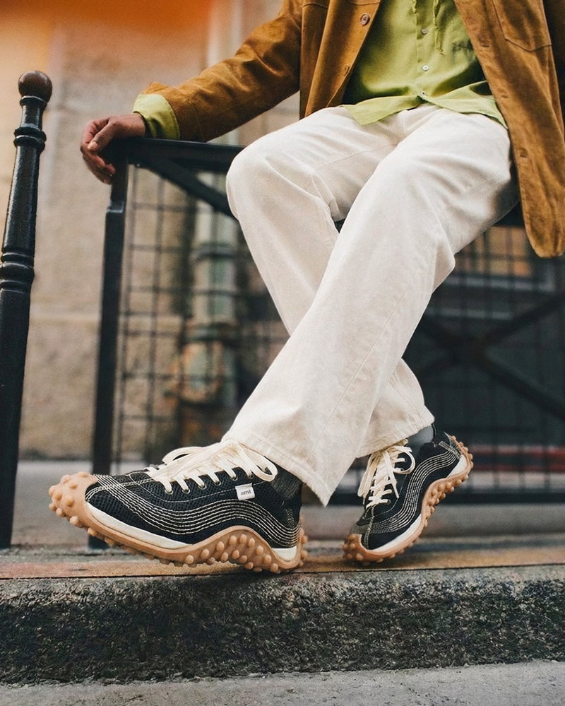 Ce qui la distingue visuellement, c’est ce mélange de retenue et d’insistance. Le dessus reste relativement sobre, surtout en cuir clair ou en mesh noir. Mais la semelle déborde, griffe le profil, accroche la lumière et casse la sagesse de la ligne. Hypebeast, lors du lancement de septembre 2025, relevait déjà cette opposition entre construction légère et base texturée, avec une sortie en mesh et en cuir lisse. Les distributeurs et détaillants reprennent d’ailleurs tous les mêmes signes extérieurs : coutures contrastées, semelle exclusive, logos injectés, produit unisexe. Rien d’explosif. Juste une sneaker qui essaie d’installer une signature sans hurler. Dans le paysage saturé des baskets “statement”, c’est presque une prise de position.