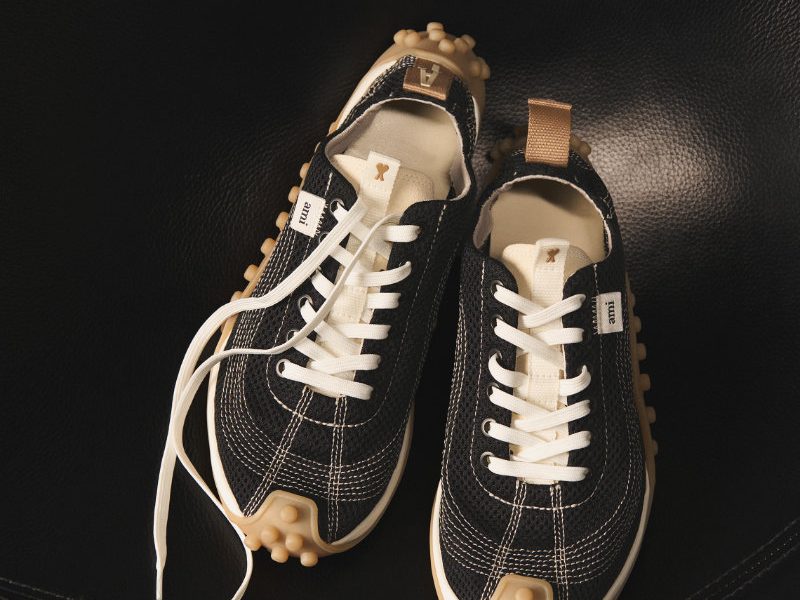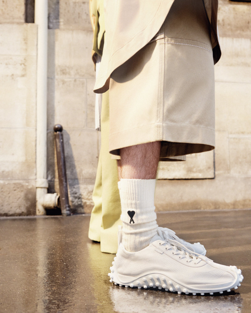 La Mirage n’arrive pas de nulle part. AMI Paris la présente comme une sneaker introduite avec l’Automne-Hiver 2025, pensée pour un vestiaire moderne et fonctionnel. La maison insiste sur une ligne “affirmée”, un confort technique et une élégance dite intemporelle. Traduction concrète : une forme basse, légère, flexible, avec une semelle crantée en gomme injectée dans un moule exclusif développé par la marque. C’est ce détail qui fait l’essentiel du regard. On voit d’abord les picots, puis les coutures courbes, puis les logos. Le genre de chaussure qui fait mine de ne pas poser de question, alors qu’elle occupe toute la phrase.