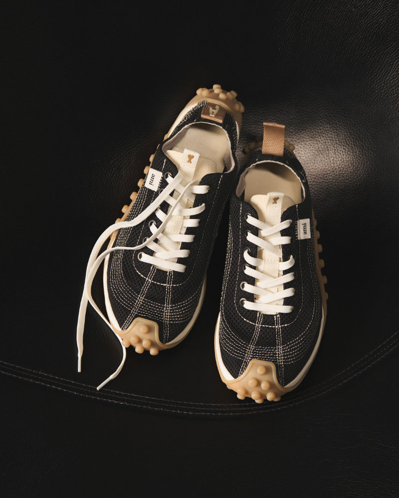 Le 14 mars, arrive de nouveaux modèles dans cette ligne Mirage. On découvre deux exécutions principales : une version en cuir nappa noir et blanc, et une version mesh déclinée en beige, gris, jaune et noir. Les pages officielles d’AMI, selon les régions consultées, décrivent de leur côté une offre plus large, avec trois familles — mesh, cuir nappa souple et knit — et des coloris qui varient selon les marchés. Ce qui reste stable, c’est la structure : tige souple, languette microfibre, semelle EVA et gomme, logos Ami de Coeur sur la languette et “AMI” au talon. La fiche technique est nette. Le geste mode, lui, consiste à faire passer tout cela pour une évidence.