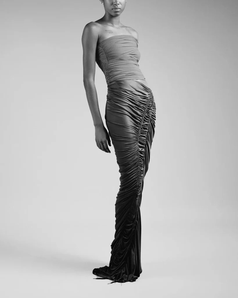 En 2016, il lance Atlein, une maison à taille humaine, fondée sur un pari rare : construire une mode durable, non pas comme concept marketing, mais comme méthode de travail. Pas de surproduction. Pas d’effets forcés. Pas de couture spectaculaire pour exister dans un défilé. À la place, une esthétique organique, sculptée dans la matière. Atlein séduit par sa précision : drapés qui suivent le buste, torsions contrôlées du jersey, silhouettes qui semblent respirer d’elles-mêmes. Les robes se tordent, bougent, se plient. Rien ne fige. Tout vit.