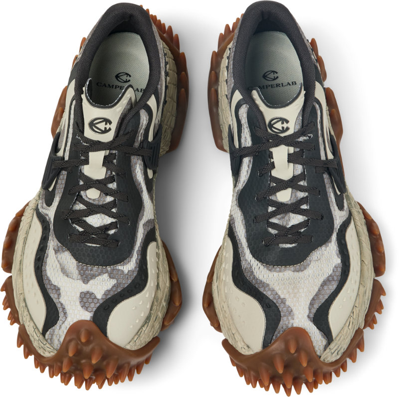 Le contraste fait le reste, et c’est là que Camperlab est assez malin : au-dessus de cette agressivité assumée, l’empeigne se tient. On parle d’un mesh (recyclé) et, côté fiche produit, d’une tige en polyester recyclé. Pas de baroque gratuit : une construction faussement simple, une allure de chaussure de randonnée “classique” jusqu’au moment où la semelle vient contredire l’ensemble, comme si la chaussure avait été monté à partir de deux humeurs incompatibles.