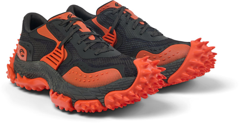 Ce qui aimante d’abord le regard, ce n’est pas une couleur ni un logo : c’est une forme. La Tornado est dessinée par une semelle extérieure en caoutchouc dont les crampons pointus filent du bout au talon, comme une rangée d’épines qui refuse l’idée même de “profil discret”. On peut la décrire comme une semelle “warped” — tordue — hérissée de pointes, et insiste sur l’effet de vortex produit par cette sculpture au ras du sol.