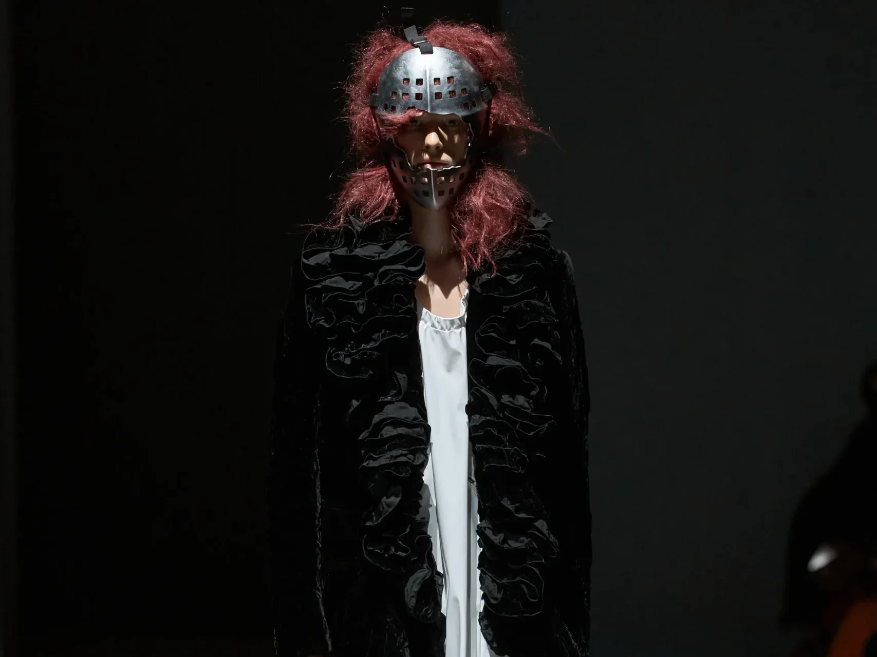 Vogue situe d’emblée l’intention dans le titre même, « Black Hole », et dans la façon dont le défilé s’autorise une spéculation cosmologique, non comme effet de storytelling, plutôt comme manière de rappeler que l’œuvre de Rei Kawakubo avance par cycles, fidélité et reconfigurations successives. La maison ne donne pas ici un “thème” à illustrer, elle donne un cadre mental: un univers noir, dense, qui absorbe les certitudes de la saison, et commence par retirer au corps sa psychologie habituelle. Les modèles portent des perruques hérissées, des masques de hockey, des signes qui neutralisent le visage et déplacent toute la lecture vers la construction des vêtements.