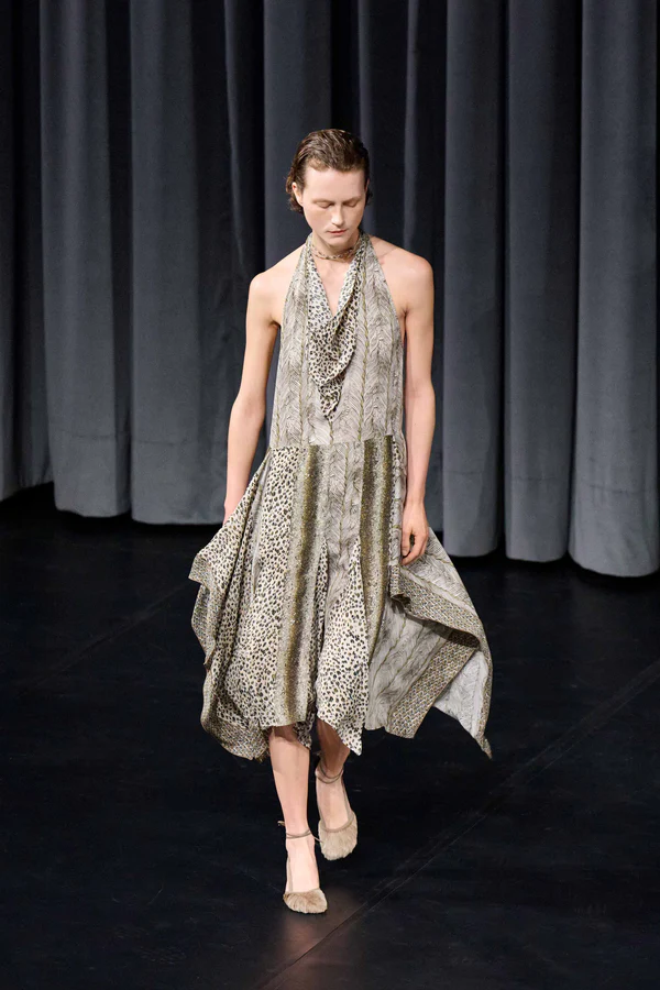 Le titre, “Mine Eyes”, vient du Sonnet 43 de Shakespeare, précise Vogue, et l’on sent que cette référence n’est pas un clin d’œil culturel mais un mode d’emploi : voir autrement, voir dans l’ombre, accepter qu’une silhouette ne livre pas tout d’un coup. Lemaire et Sarah-Linh Tran parlent souvent de cinéma et de personnages “réels” comme matrice de saison ; ici, le vocabulaire devient presque philosophique, “très terre-à-terre” et pourtant “un peu irrationnel”, dit Christophe Lemaire — et c’est exactement l’endroit où la marque excelle : dans cette zone trouble où l’utilitaire se charge d’affect, où la fonctionnalité se met à faire du récit. Le Monde, lui, liste des types humains — sages en combinaisons utilitaires, danseurs en robes sable, aventuriers en cuir, esthètes en léopard — non pour folkloriser, mais pour signaler que Lemaire travaille l’allure comme une distribution : une troupe plutôt qu’un casting.