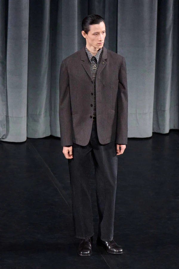 Sous le calme Lemaire, il y a toujours une manière de ruser. Vogue parle de velours froissé “comme un métal liquide”, de robes à franges enroulées, de deux-tons qui “interagissent” doucement avec le corps ; il cite aussi Doona Bae, présente dans une robe à franges noire — apparition qui dit quelque chose du goût Lemaire pour les présences plutôt que pour les célébrités en vitrine. Hypebeast pousse cette idée d’illusion plus loin : denim laqué mimant le cuir, velours luisant comme matière-miroir, accessoires presque surréalistes (jusqu’à des pendentifs en forme de clé dissimulant un tire-bouchon). Ce qui est frappant, c’est que cette sophistication ne se présente jamais comme luxe ostentatoire : elle est cachée dans la surface, dans l’écart entre ce que l’œil croit voir et ce que la main comprendrait. Chez Lemaire, la sobriété n’est pas une morale ; c’est une technique de brouillage.
