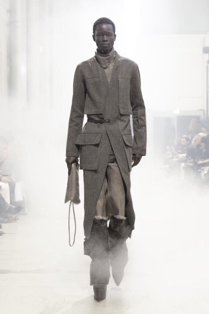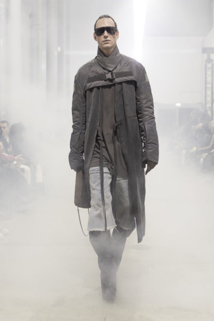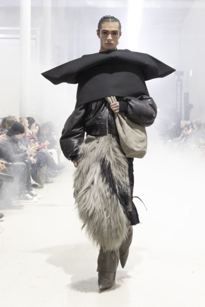 Vogue raconte des mannequins qui surgissent d’une fumée glacée, “sage-scented dry ice”, comme s’ils traversaient un gaz lacrymogène imaginaire ; WWD résume le show comme celui “remembered for the scented fog”. Ce n’est pas un gimmick : c’est une manière de rappeler que l’uniforme (police, armée, sécurité, contrôle) est d’abord une sensation physique, un rapport au souffle, à la visibilité, à l’espace. Et parce que la session homme Automne/Hiver 2026-2027 s’écrit officiellement sous l’ombre du Palais de Tokyo, cette esthétique du béton, du froid, du volume industriel n’a même plus besoin d’être “créée” : elle est déjà là, prête à devenir décor de menace. Rick Owens l’exploite avec une économie de moyens qui ressemble à une autorité : l’ambiance impose la lecture avant même que le premier look soit compris.