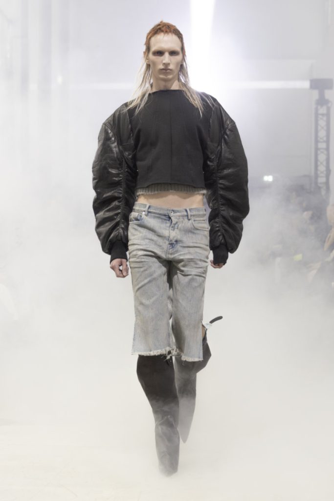 Owens assume une silhouette “skinny” (qu’il décrit comme de la “thin ice”) mais il la muscle par des vestes ultra-courtes, des flight jackets, des hybrids tactiques qui font bloc autour du torse. Le corps devient une contradiction : étroit, mais bardé ; nerveux, mais cuirassé. Certaines pièces, écrit Vogue, sont en cuir, d’autres en Kevlar, “fabric of control”, et les boots, massives, viennent briser l’harmonie en imposant au sol une autre cadence. On est loin de l’idée de “portable” comme apaisement ; ici, le portable est une tension : porter le contrôle, porter la menace, et l’exagérer jusqu’à la rendre ridicule donc, paradoxalement, jusqu’à la rendre visible.