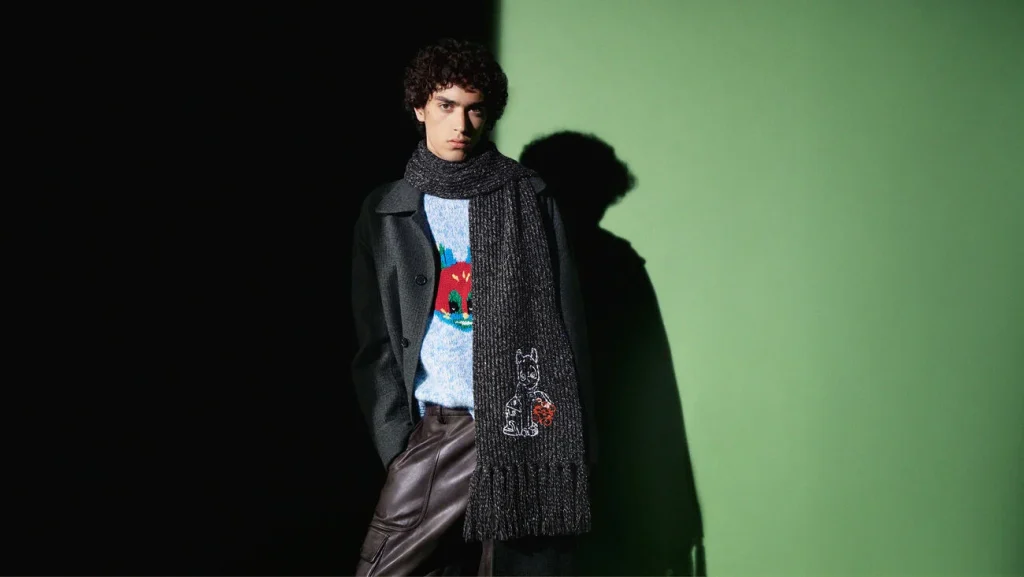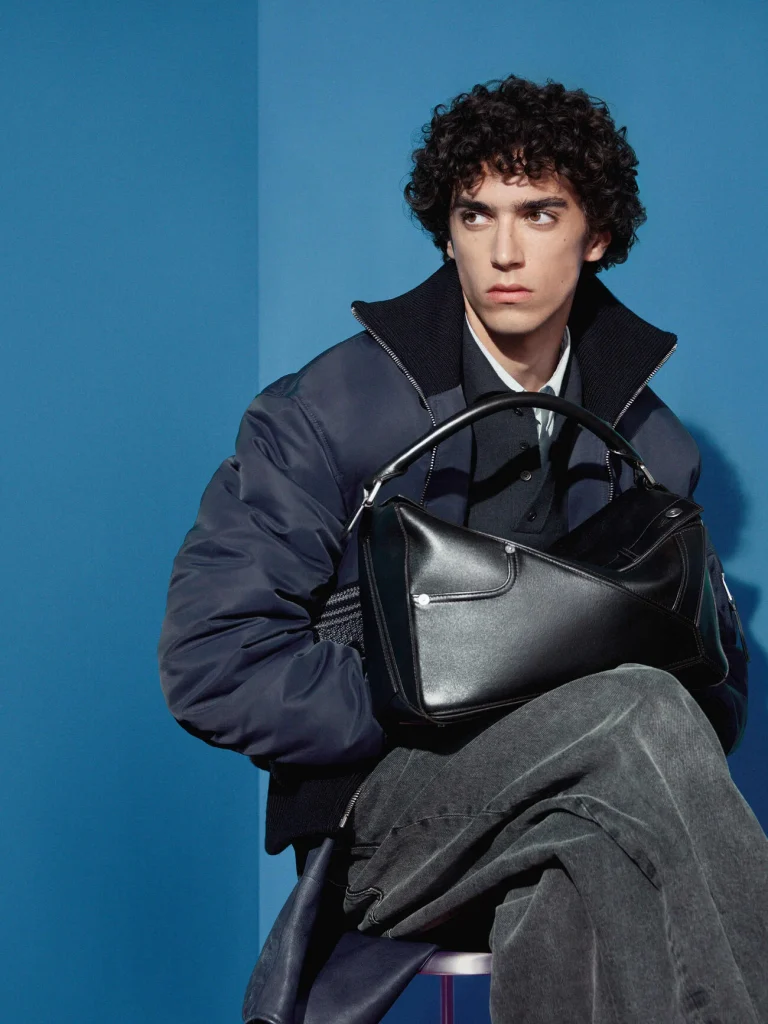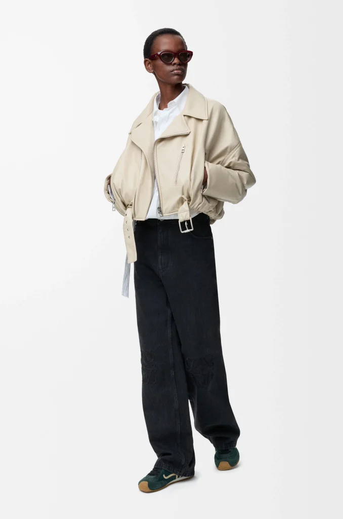 Chez Loewe, tout commence par la matière. Les cuirs nappa, le veau box, les peaux souples destinées aux sacs ou aux manteaux sont travaillés avec une attention qui dépasse la surface : il s’agit de garantir un tombé stable, une tenue précise, un vieillissement harmonieux. Le prêt-à-porter suit cette même logique. Les manteaux en drap de laine coupés net, les pantalons à plis marqués, les pulls en maille sèche traduisent une volonté de construire la silhouette à partir de la technique.