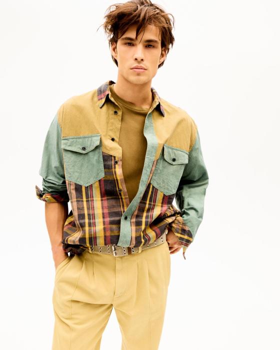 Dans le compte rendu de Vogue, la collection se construit autour d’un imaginaire années 1990 et d’une référence pop très précise : Brad Pitt période Thelma & Louise, convoqué pour une attitude plus que pour une reconstitution. D’où une série de fondamentaux assumés : t-shirt blanc “parfait”, denim “juste”, chore jacket structurante, et une nouvelle coupe de pantalon, plus nette, travaillée en crème ou en hickory stripe (Oshkosh), positionnée entre formel et casual. La palette décrite comme “desert hues” sert de liant : elle permet d’assembler patchwork, cuir par touches, carreaux (hoodie acajou, chemise color-block, veste en jean en check japonais) sans basculer dans l’illustration.