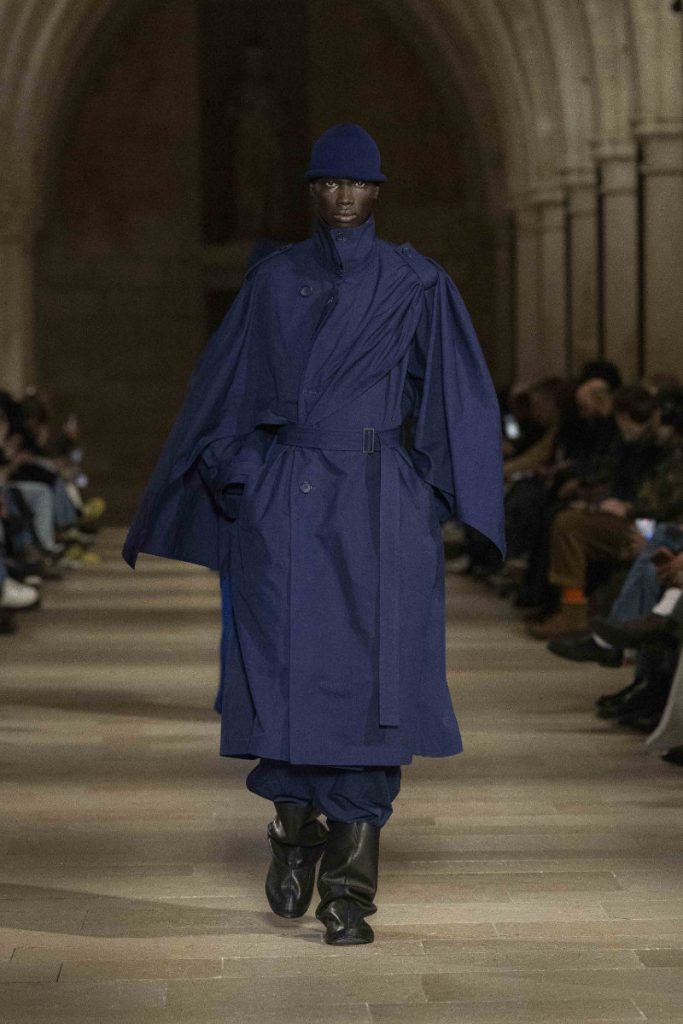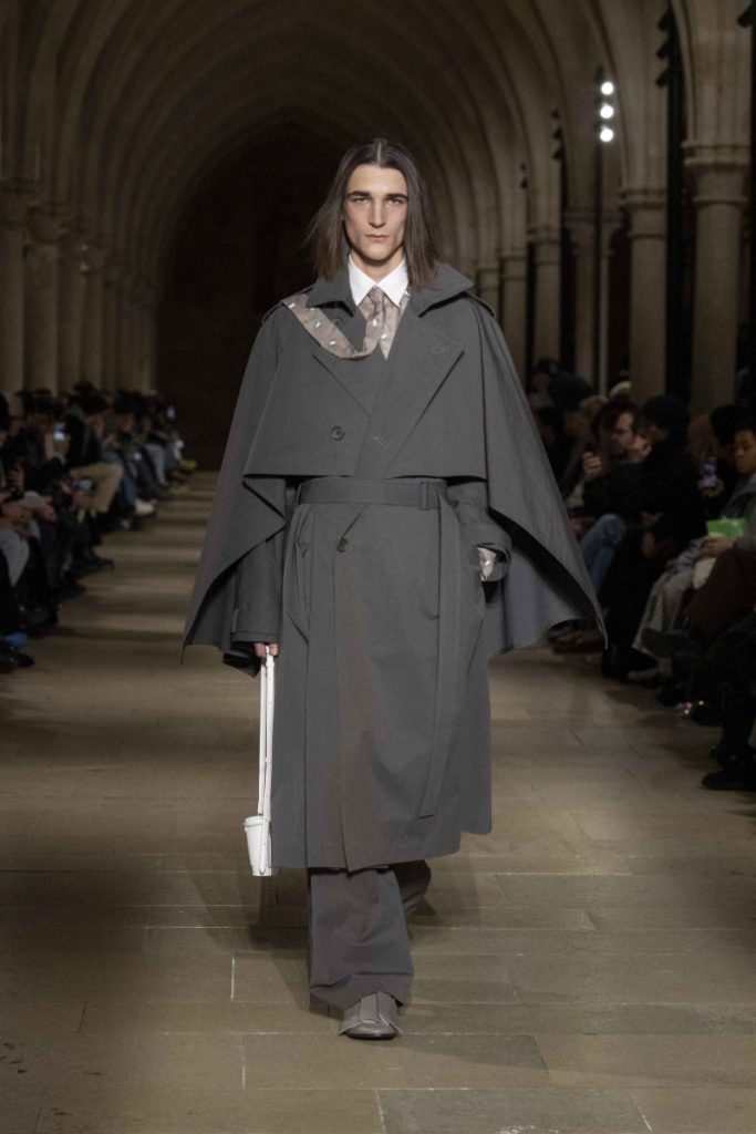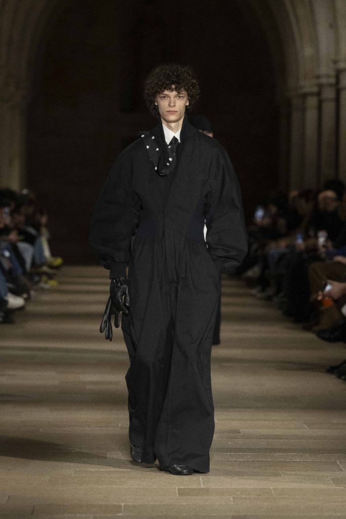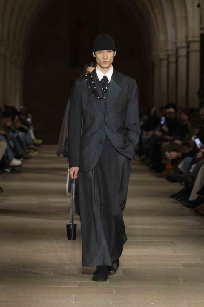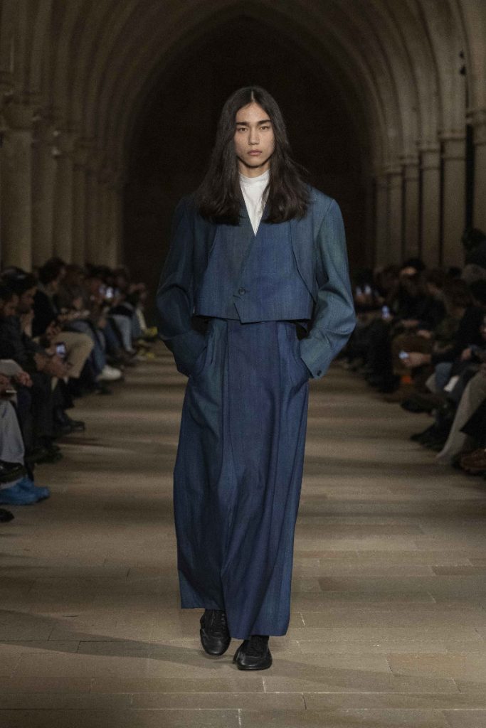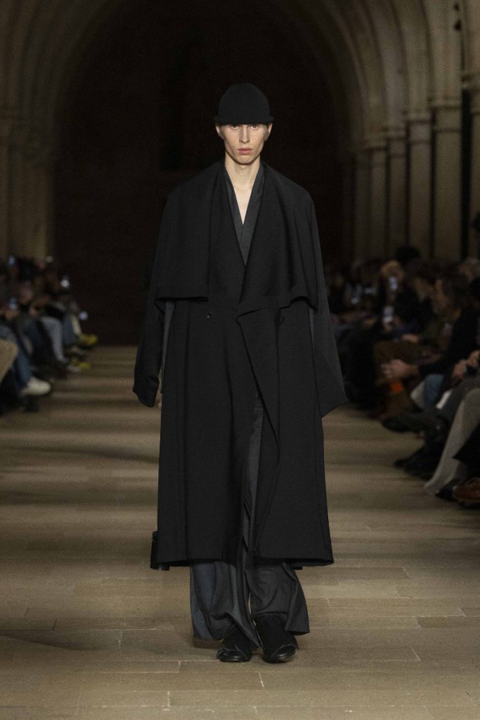Le choix du Collège des Bernardins, ancien collège cistercien du XIIIe siècle, n’est pas un simple cadre “beau” : c’est une autorité spatiale, une machine à rendre la moindre couture responsable. L’Associated Press insiste sur cette ambiance spirituelle, sur ce calme presque monastique qui infuse les silhouettes, longues, enveloppantes, robe-like sans devenir “costume”. Vogue, plus nerveux, parle d’un aspect quasi “cultish” : non pas le mystère pour le mystère, mais la sensation qu’un vestiaire peut être un système de croyance, une discipline désirée. La mise en scène fait ainsi ce que le vêtement promet : enlever du bruit, laisser la forme parler, et rappeler que, dans la mode masculine, l’autorité s’exerce souvent par la retenue plutôt que par l’emphase.