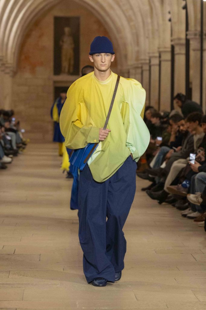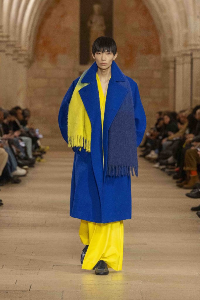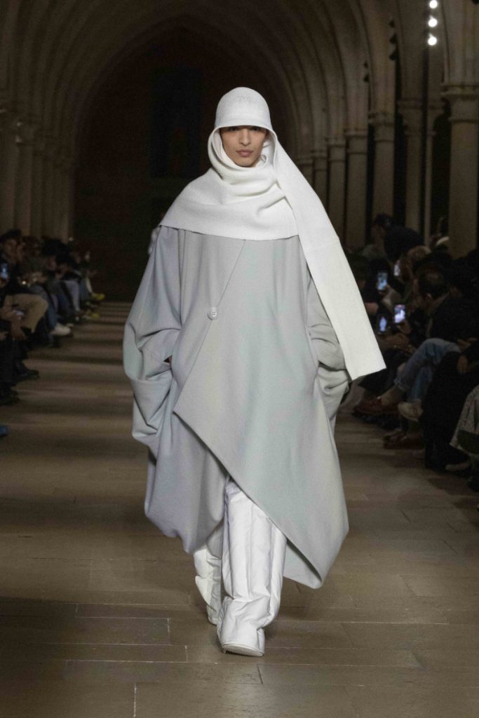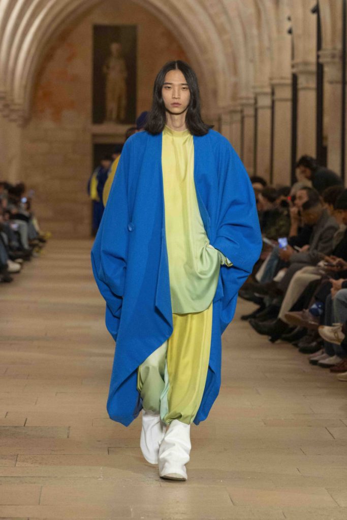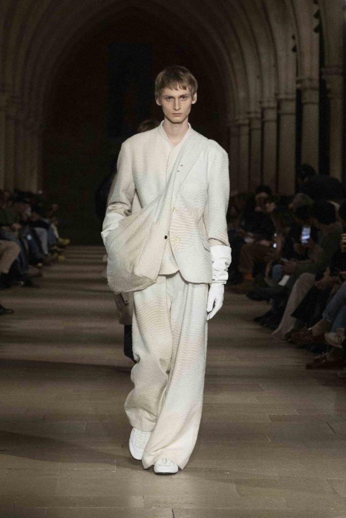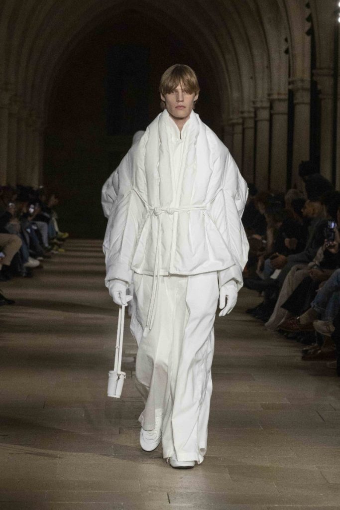 Le choix du Collège des Bernardins, ancien collège cistercien du XIIIe siècle, n’est pas un simple cadre “beau” : c’est une autorité spatiale, une machine à rendre la moindre couture responsable. L’Associated Press insiste sur cette ambiance spirituelle, sur ce calme presque monastique qui infuse les silhouettes, longues, enveloppantes, robe-like sans devenir “costume”. Vogue, plus nerveux, parle d’un aspect quasi “cultish” : non pas le mystère pour le mystère, mais la sensation qu’un vestiaire peut être un système de croyance, une discipline désirée. La mise en scène fait ainsi ce que le vêtement promet : enlever du bruit, laisser la forme parler, et rappeler que, dans la mode masculine, l’autorité s’exerce souvent par la retenue plutôt que par l’emphase.
