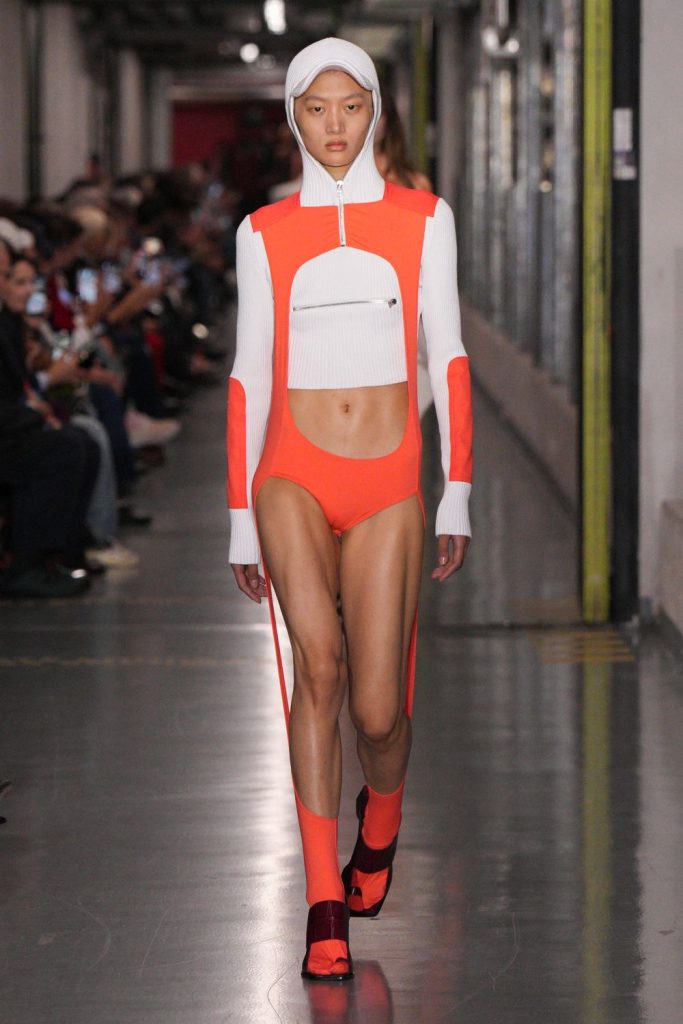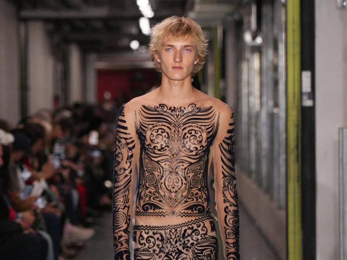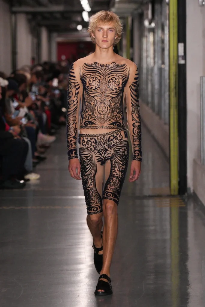 Dès les premiers looks, le ton est donné. Les marinières, emblèmes de Gaultier, sont explosées, déchirées, réassemblées en patchworks improbables. Les corsets, autre signature de la maison, deviennent des pièces hybrides, parfois imprimées de poils ou de motifs trompe-l’œil évoquant une pilosité masculine. Un manteau blanc surdimensionné, aux volumes sculpturaux, rappelle les « cocons » des années 90, tandis que des catsuits imprimés de torses masculins bousculent les notions de genre et de nudité.