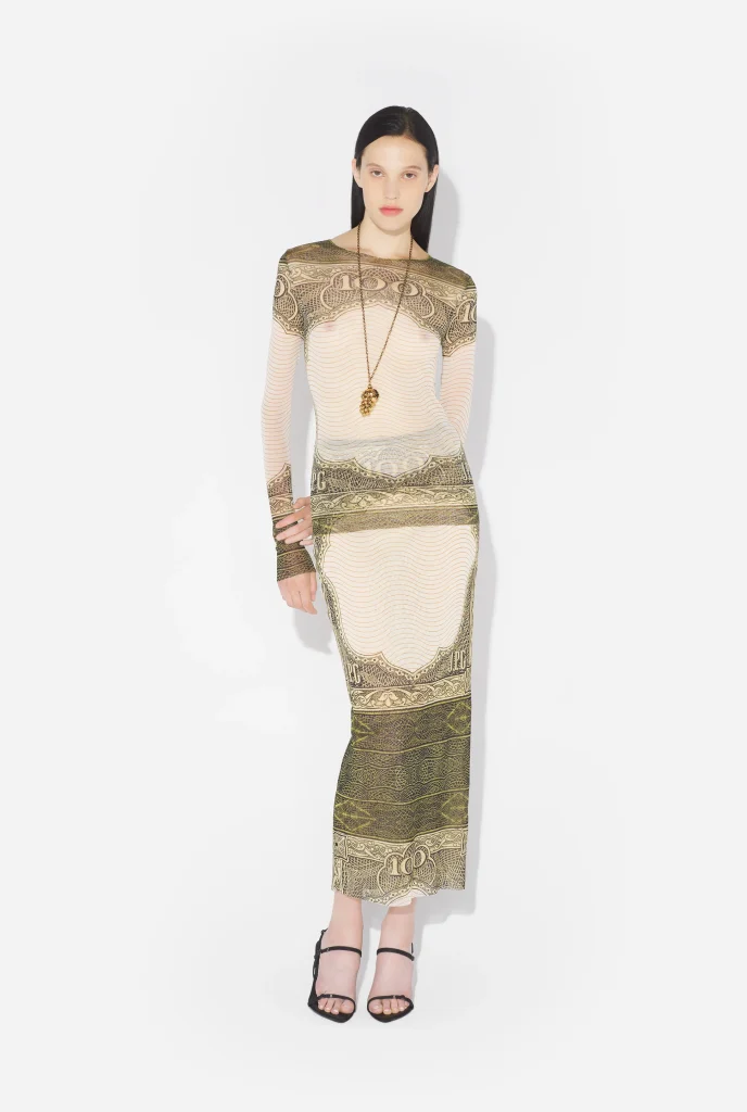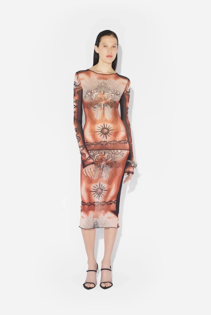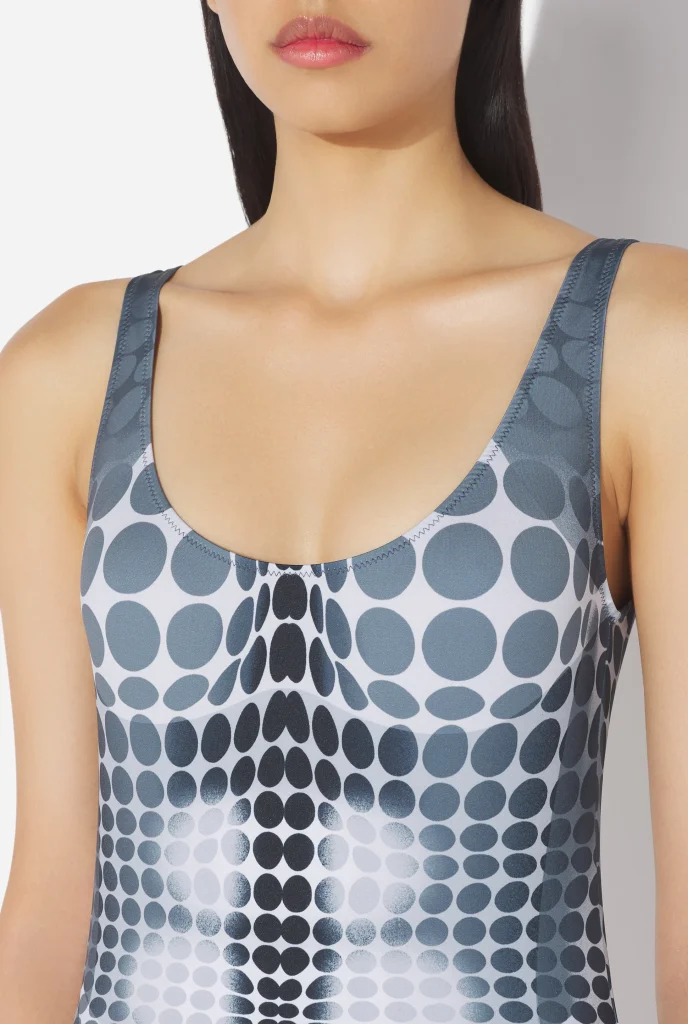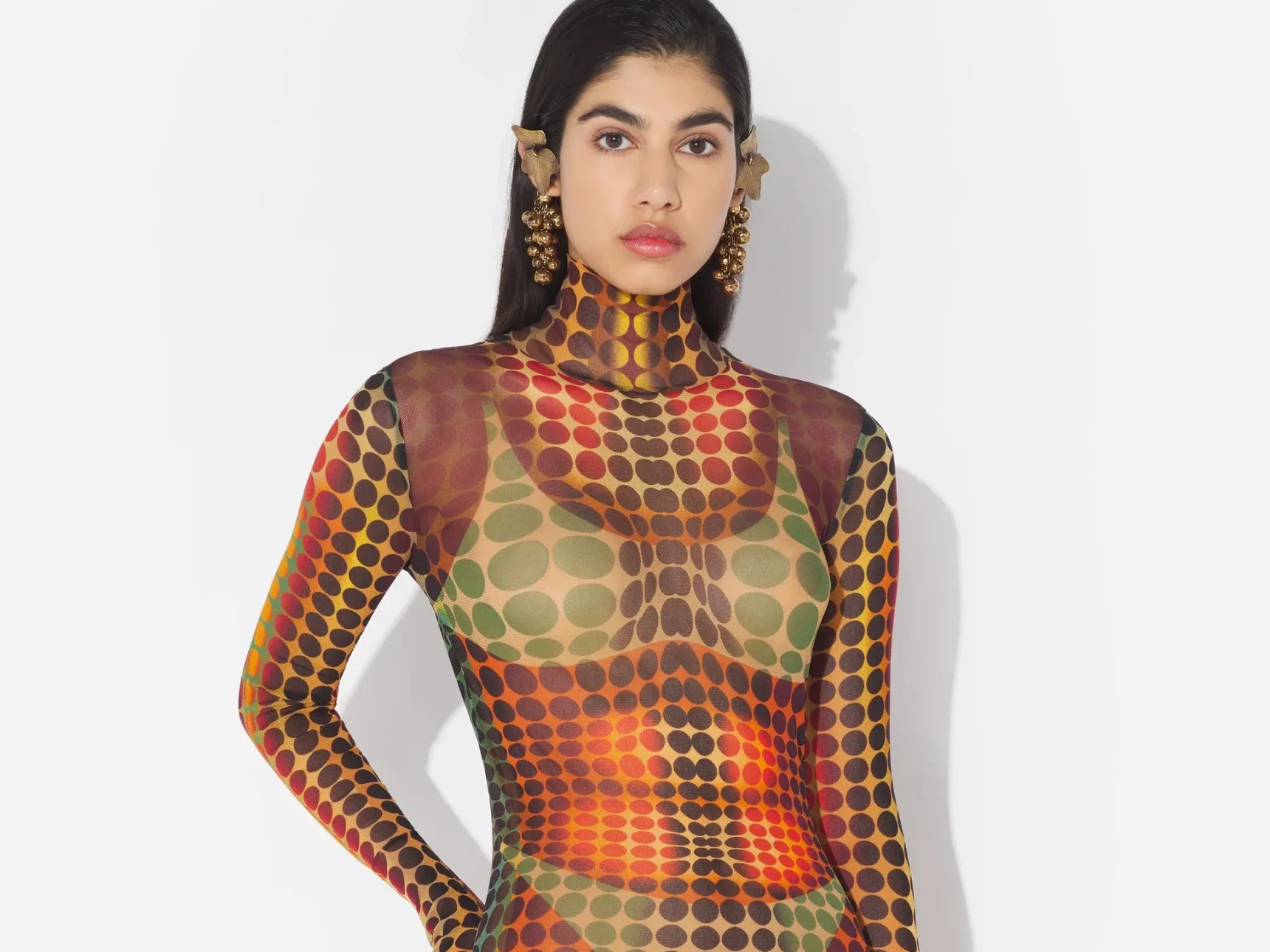 Les Dots, pois réguliers et hypnotiques, complètent cette trilogie graphique. Minimalistes en apparence, obsessionnels dans leur répétition, ils rappellent la période où Gaultier travaillait l’imprimé comme une pulsation. Déclinés en noir et blanc, en bleu profond ou en brun chaud, ils reviennent aujourd’hui sur des silhouettes modernes : tops mesh, robes longues, pantalons ajustés, maillots seconde peau. Une manière discrète mais efficace de réintroduire un code de la maison dans le quotidien.