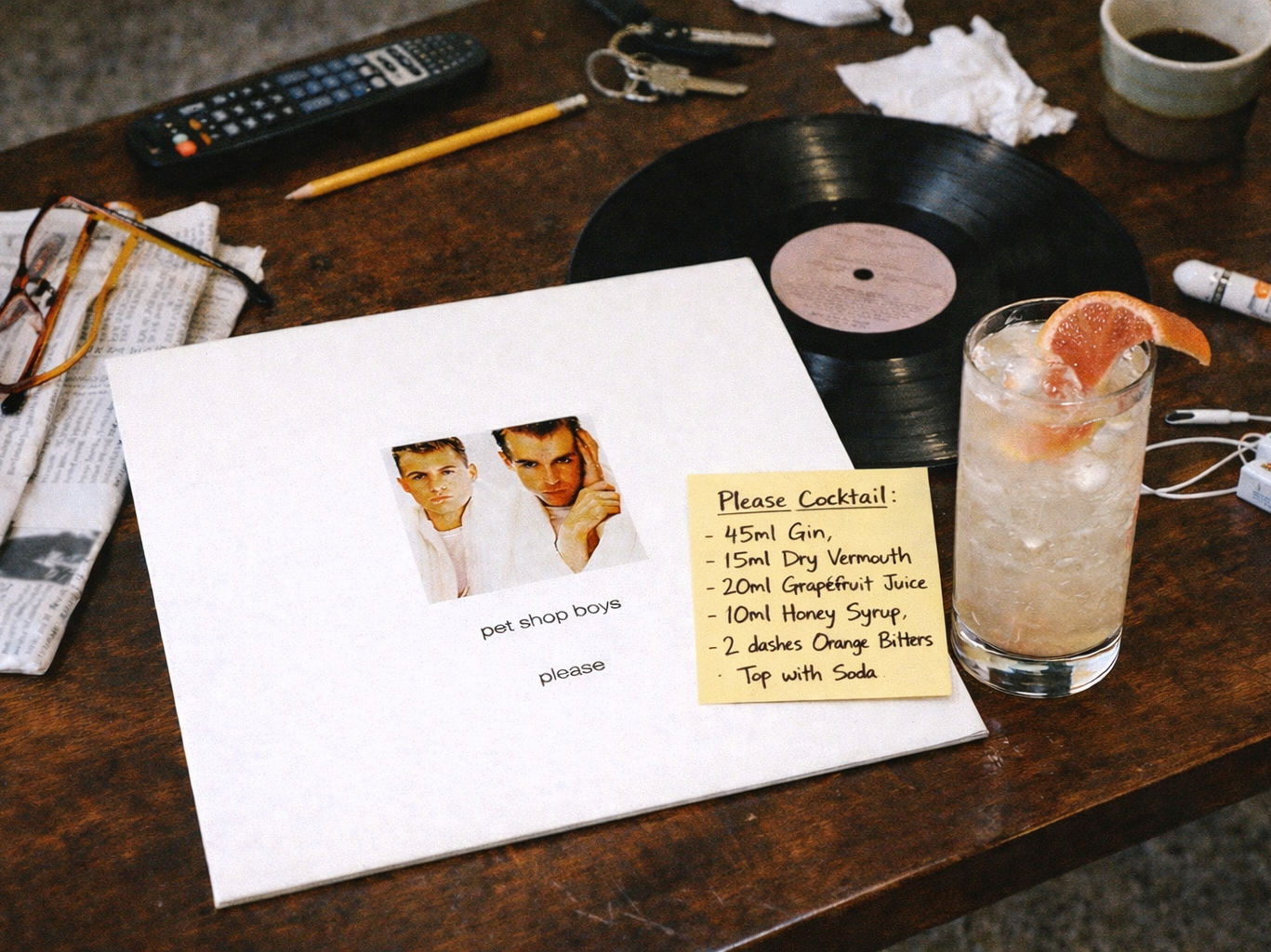 Ça se boit sur West End Girls, quand l’intro installe ce mélange de théâtre et de rue. La dilution fait le travail du temps : au début, tout est net ; au milieu, tout se mélange ; à la fin, l’amertume ressort et le verre devient plus sec. Ce mouvement colle au disque, qui commence par séduire et finit par insister. Le cocktail supporte aussi Opportunities, parce qu’il a cette fausse facilité, cette brillance qui cache une gêne. Sur Love Comes Quickly, le miel devient presque suspect, comme une tendresse trop bien rangée. Le meilleur moment, c’est quand la boisson n’est plus glacée mais reste froide : là, les angles apparaissent. Rien n’explose, rien ne s’effondre, tout se maintient. Et quand le verre est vide, il reste ce goût d’agrume amer sur la langue, comme si la politesse avait laissé une trace.