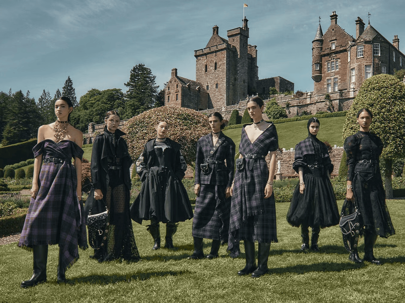 Il faut voir la scène. Les haies taillées, les allées nettes, la pierre froide, puis les silhouettes qui passent avec la gravité empruntée au lieu. Chez Dior, le 3 juin 2024, les jardins de Drummond Castle servent de caisse de résonance à une collection croisière saturée de références écossaises, du tartan aux broderies, avec cornemuses à l’ouverture et à la fermeture. La maison parle elle-même d’un “trésor architectural et historique”. Reuters, de son côté, décrit un défilé nourri de chardons, de kilts, de tweeds et d’allusions à Marie Stuart. Le lieu n’est pas un simple décor. Il cadre la lecture avant même le premier look. La collection arrive déjà légendée par les pierres, les terrasses et le prestige du jardin.