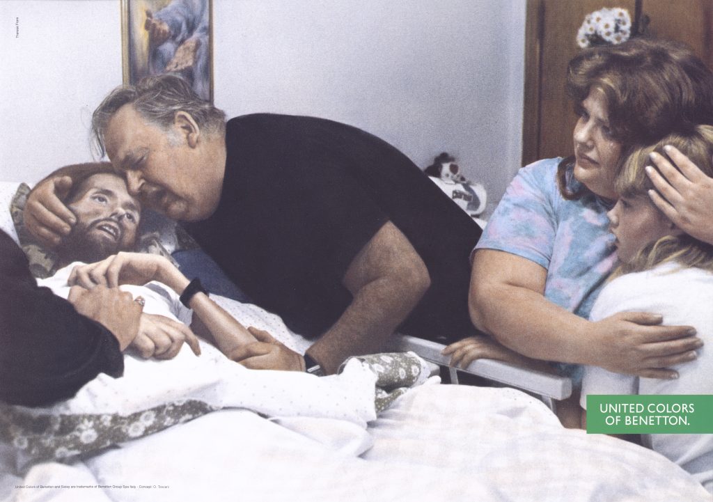 1992 : Une image née ailleurs arrive sur les murs et dans les magazines : David Kirby mourant du sida, photographié par Therese Frare, publiée par LIFE en novembre 1990. Benetton reprend la scène. La photo, devenue publicité, garde son sujet de chambre d’hôpital, de famille et de mort mais elle change de statut : elle n’informe plus, elle circule parce qu’une marque finance sa circulation. Le détail qui glace, c’est la fabrication même de l’effet. TIME raconte comment l’image a été colorisée pour la version Benetton, avec une minutie qui cherche la “présence” et finit par fabriquer un surcroît de réalité. Une publicité qui emprunte au photojournalisme son autorité, puis en renforce artificiellement la densité, comme si l’éthique passait par une couche de pigment.
