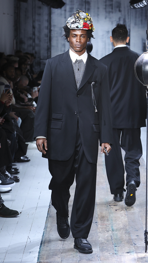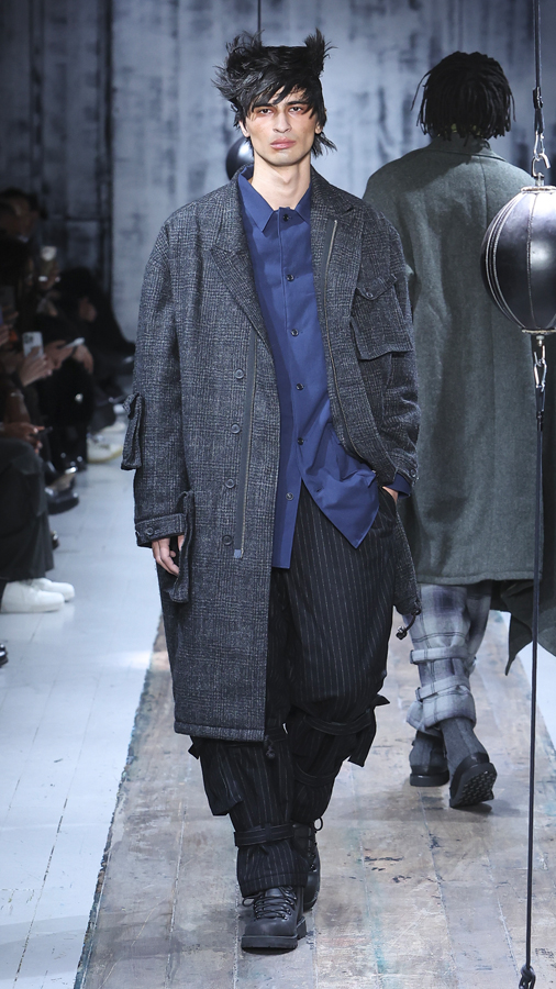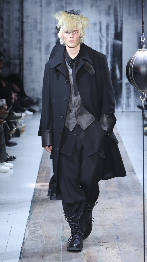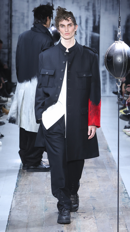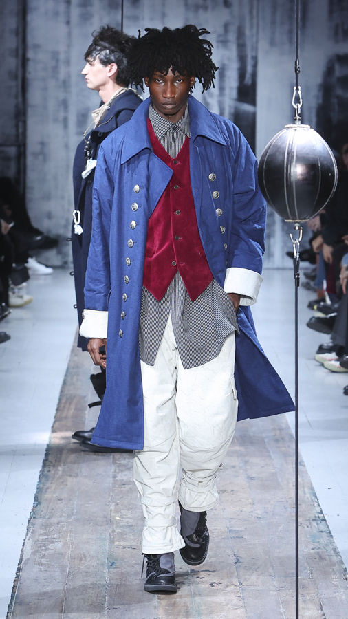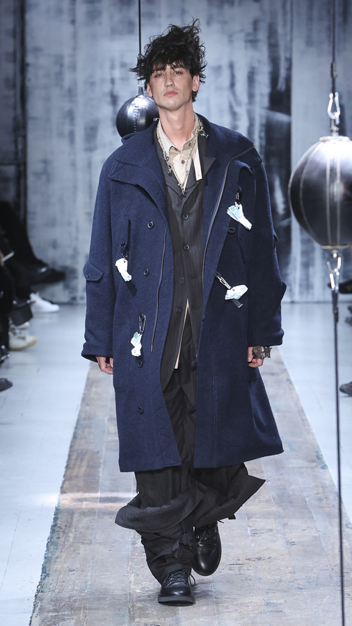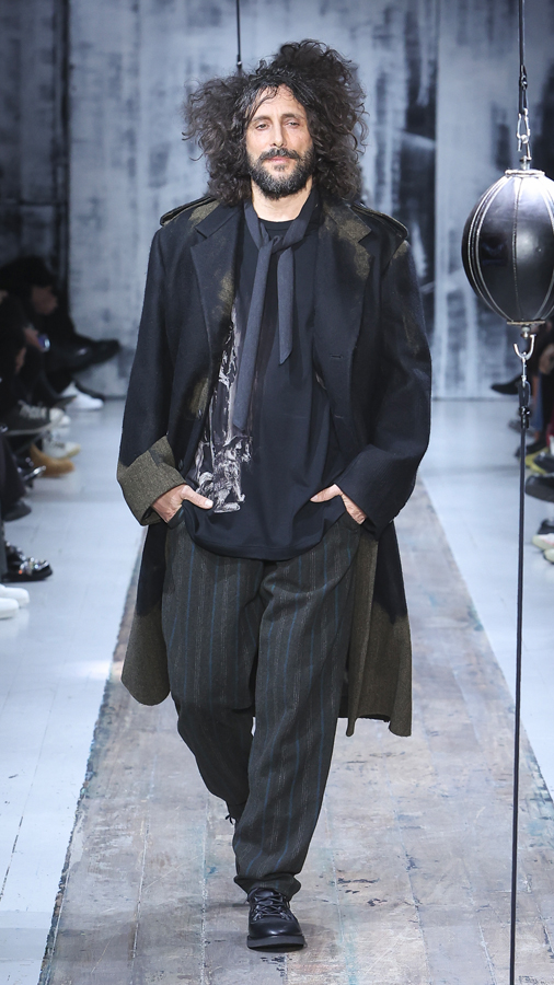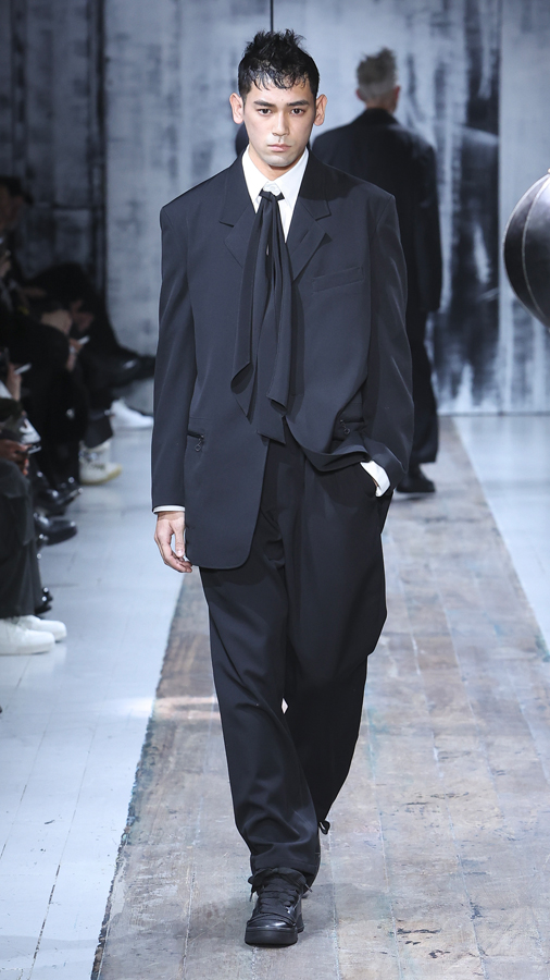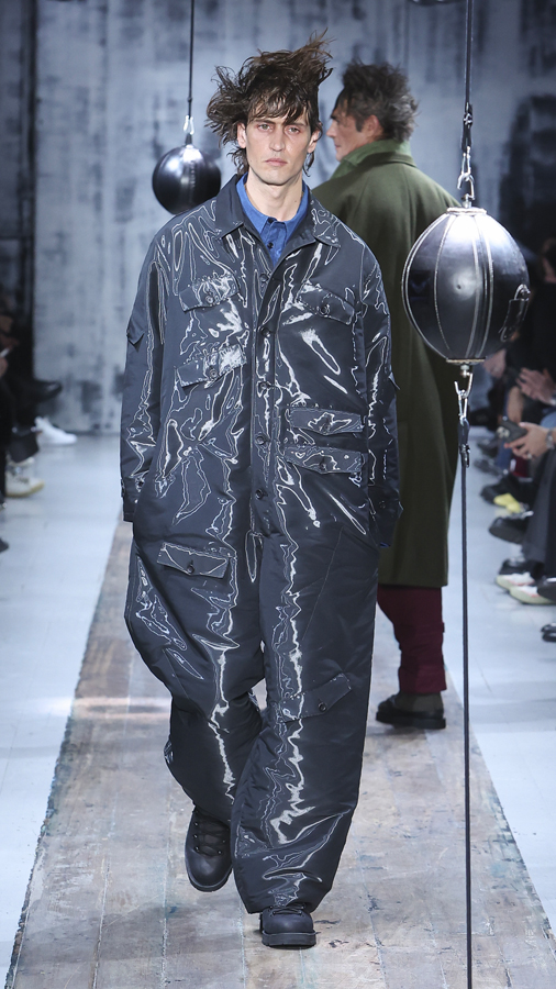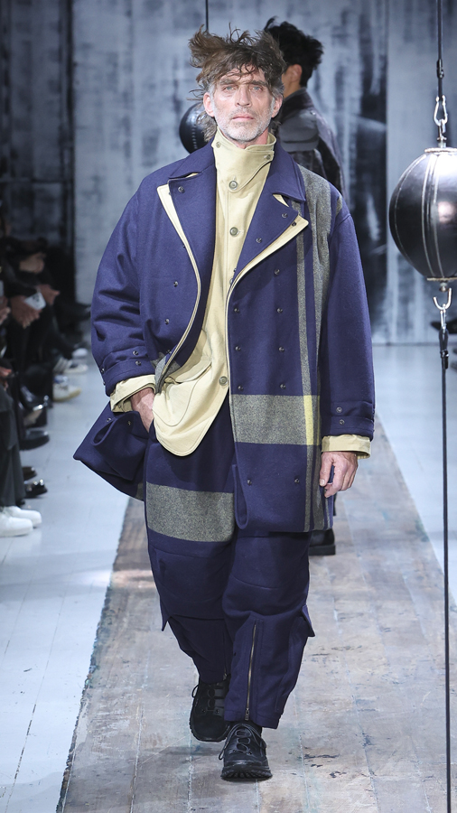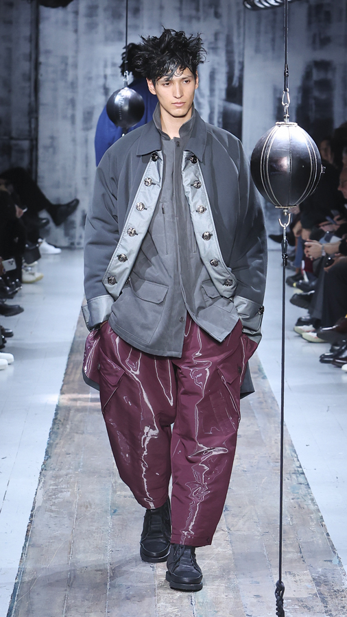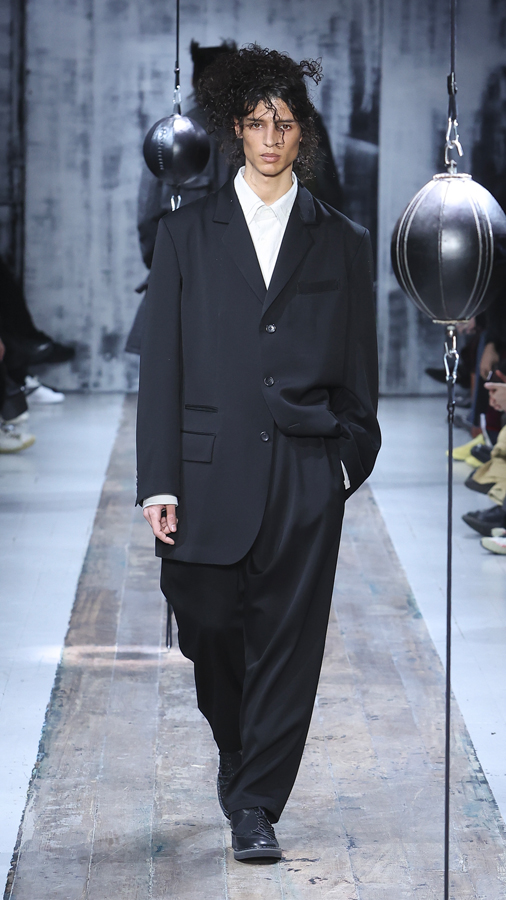 Ce qui frappe, c’est que l’on parlent peu de musique. Ce silence vaut choix esthétique, et peut-être stratégie : au lieu de fabriquer l’émotion par le son, Yamamoto la déplace vers la gravité des matières, le frottement des couches, et surtout vers le micro théâtre des gestes imposés par les punching balls. Dans une saison où tant de défilés cherchent une dramaturgie explicite, le sien semble faire confiance à une dramaturgie physique, presque muette : le montage émotionnel se construit par alternance de retenue et de pulsion, par la façon de toucher ou de frapper, par ce moment où l’on ne peut plus faire semblant de passer sans rencontrer.
