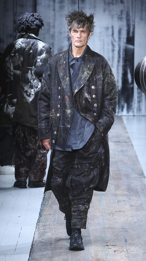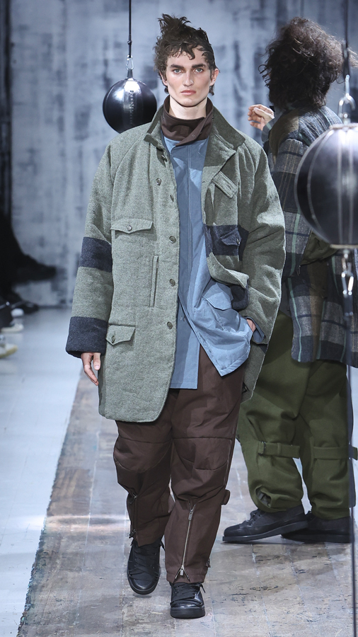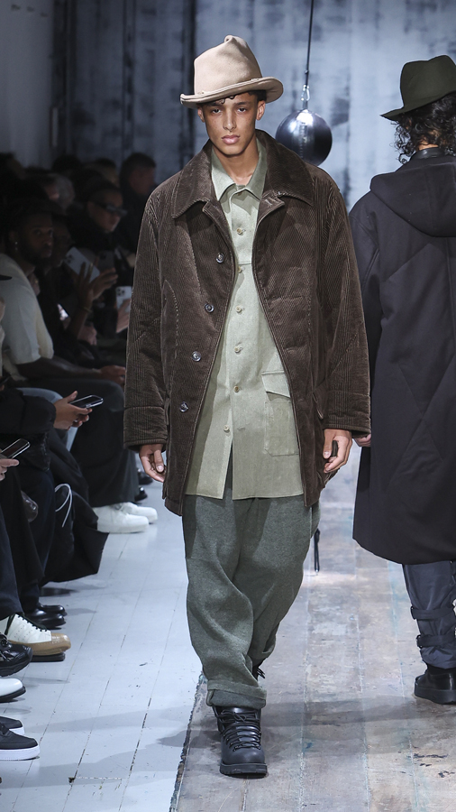 La collection s’écrit comme un uniforme qui aurait perdu la certitude de l’uniforme. La presse insiste sur le padding, le long des bras et jusque dans les jambes, qui égalise les corps, leur donne une silhouette commune, puis la remet en jeu par des boutons dits “d’infanterie” capables de reconfigurer le volume. L’imaginaire militaire et mécanique apparaît, mais il ne produit pas une virilité conquérante : il dérive vers l’équipement, la protection, l’endurance. AP, dans sa lecture plus large de la semaine, repère chez Yohji Yamamoto cette manière de faire du vêtement une défense contemporaine, sans triomphe, presque sans posture. Et puis, chez Yamamoto, l’armure est toujours contaminée par la matière du quotidien : flanelles et blanket wools, superpositions lourdes mais vivantes, comme si l’homme qu’il met en scène n’avait pas de cérémonie, seulement une météo intérieure à traverser.